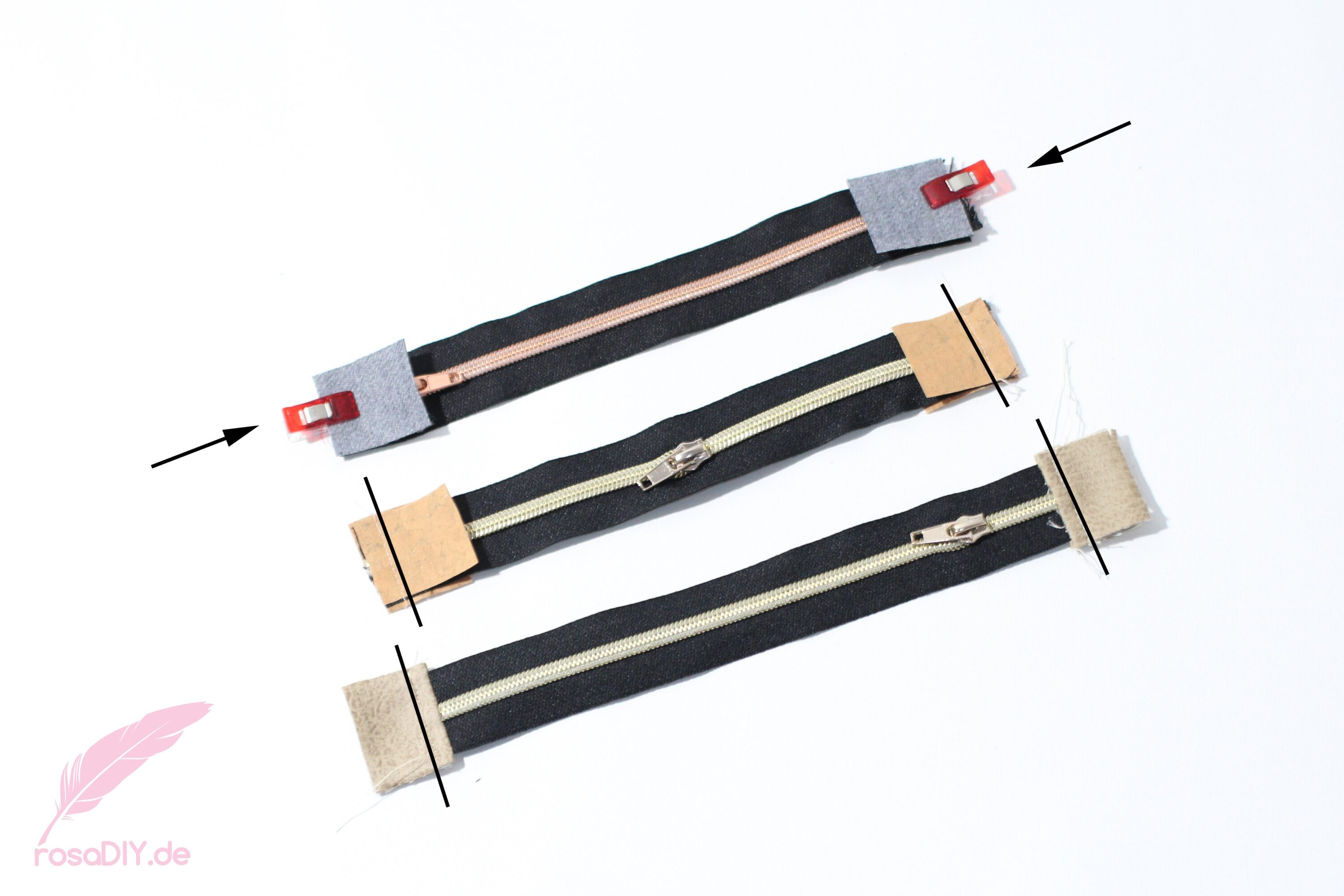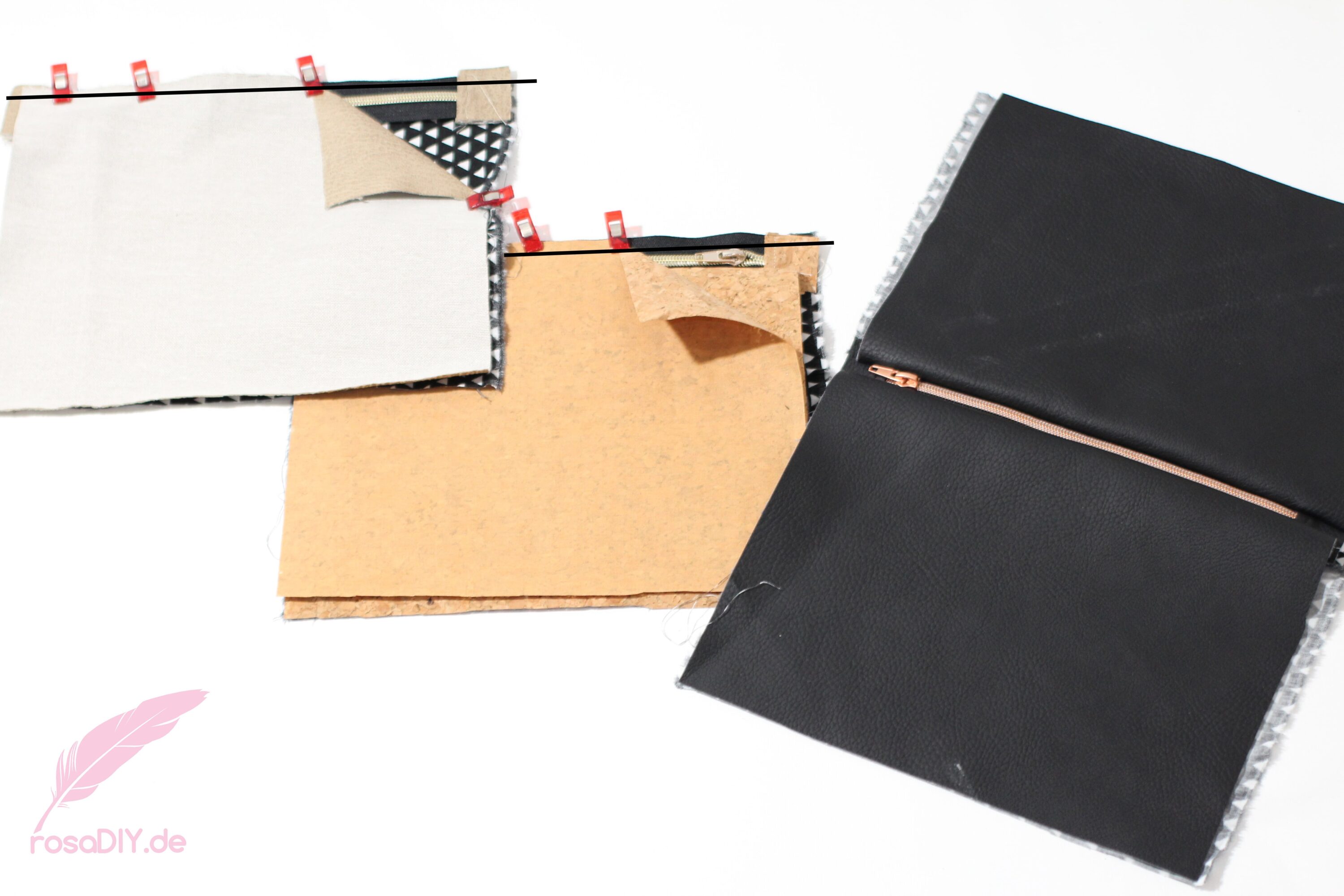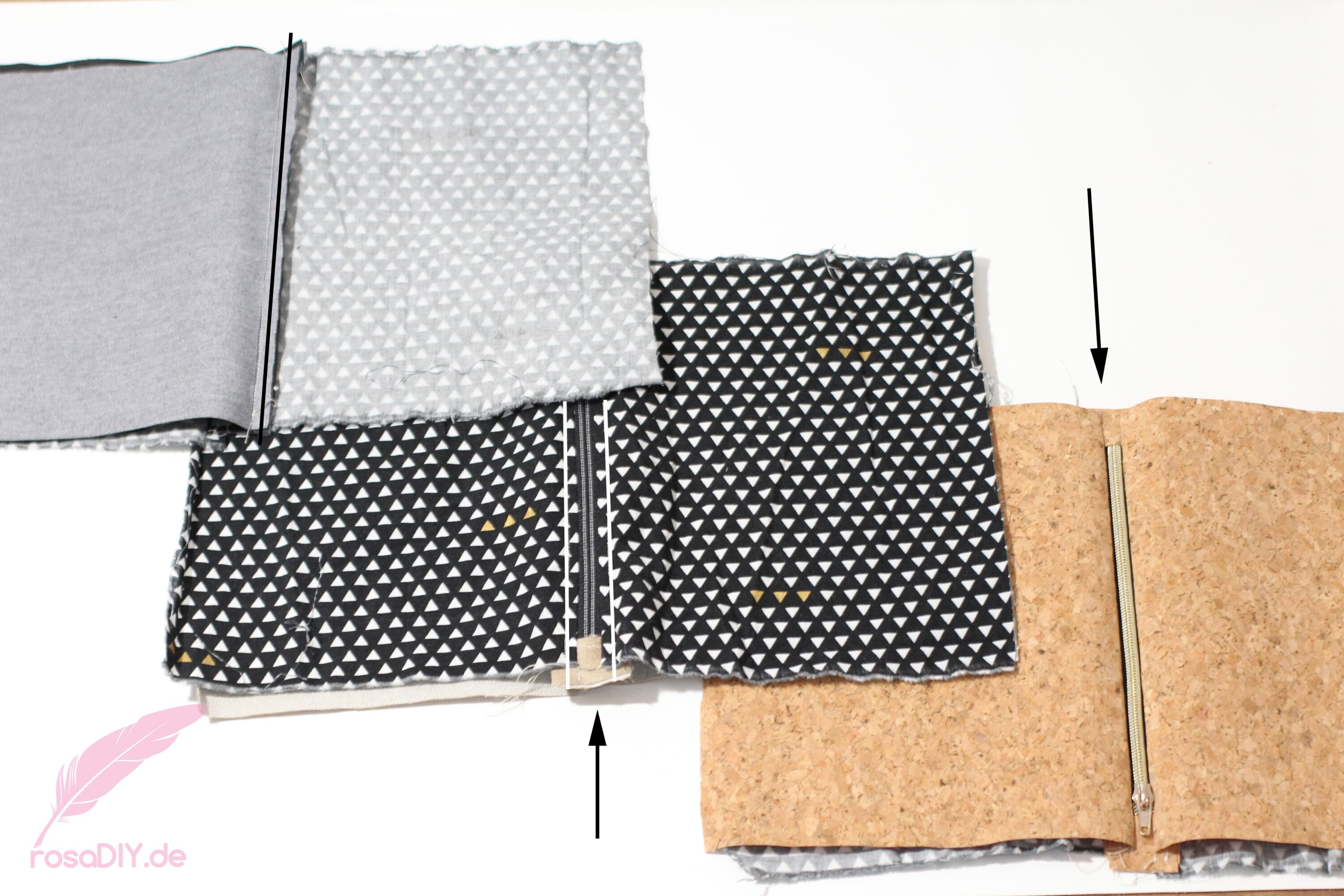 (1) Zuerst werden die 12 Quadrate an den Reißverschluss genäht, da meine drei Taschen aus unterschiedlichen Materialien sind, habe ich die Quadrate auch dementsprechend zugeschnitten (also jeweils 4 Quadrate aus beigem & schwarzem Kunstleder und 4 aus Kork). Anschließend jeweils ein Quadrate von unten und oben an jeden Anfang & Ende des Reißverschlusses legen und fixieren (rechte Seite zeigt zum Reißverschluss), dann festnähen, aufklappen und absteppen.