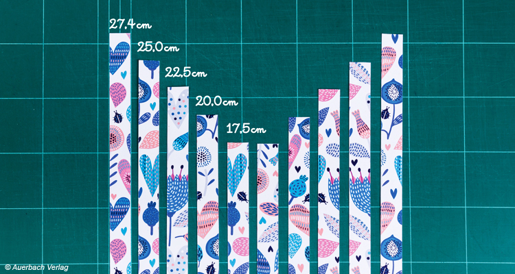 Die geschnittenen Streifen müssen nun in die richtige Länge gebracht werden: Kürze die Streifen den Angaben auf dem Bild entsprechend ein